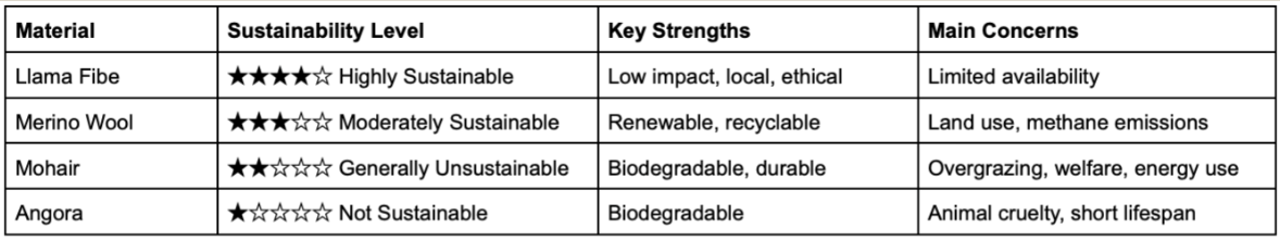 Knit to Last—Ranking the Sustainability of Llama, Merino, Mohair, and Angora Fibers