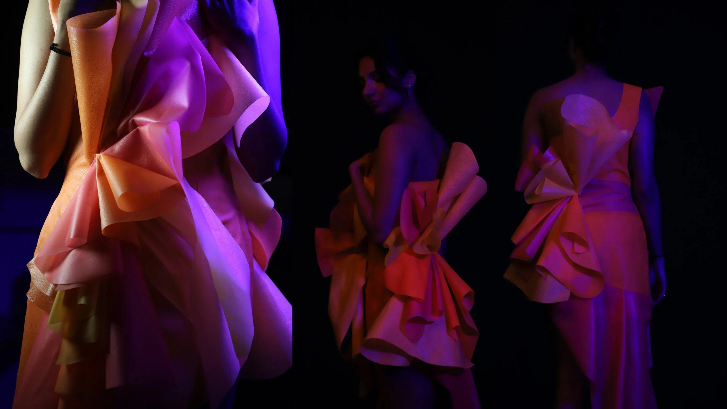 This philosophy translates directly into her design approach. She is not simply creating garments; she is carrying forward a lineage. The care, patience, and reverence that have defined Indian textiles for centuries shape how she experiments with bioplastics today. For her, material innovation is not a break with tradition but its continuation in a new language.